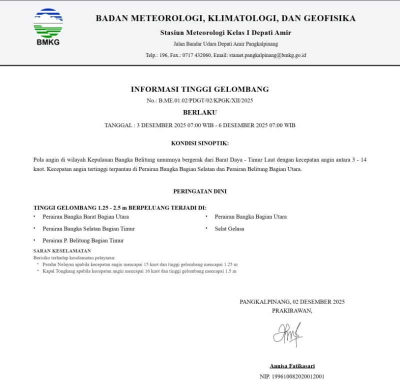 PANGKALPINANG, jendelapersada.com — Badan Meteorologi, Klimatologi, dan Geofisika (BMKG) Stasiun Meteorologi Kelas I Depati Amir Pangkalpinang mengeluarkan peringatan dini tinggi gelombang yang berlaku mulai 3 Desember 2025 pukul 07.00 WIB hingga 6 Desember 2025 pukul 07.00 WIB.