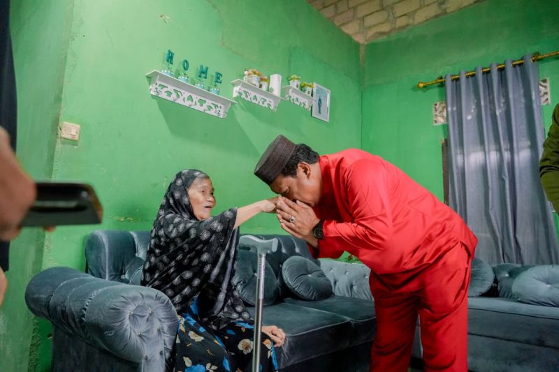PANGKALPINANG, jendelapersada.com — Di sebuah rumah sederhana bercat hijau lembut di Kelurahan Masjid Jamik, Pangkalpinang pagi itu. Cahaya yang masuk dari sela gorden abu-abu menimpa sebentuk pemandangan yang tak selalu hadir dalam riuh rendah urusan pemerintahan: seorang pemimpin daerah membungkuk, merendahkan diri di hadapan warganya yang renta.