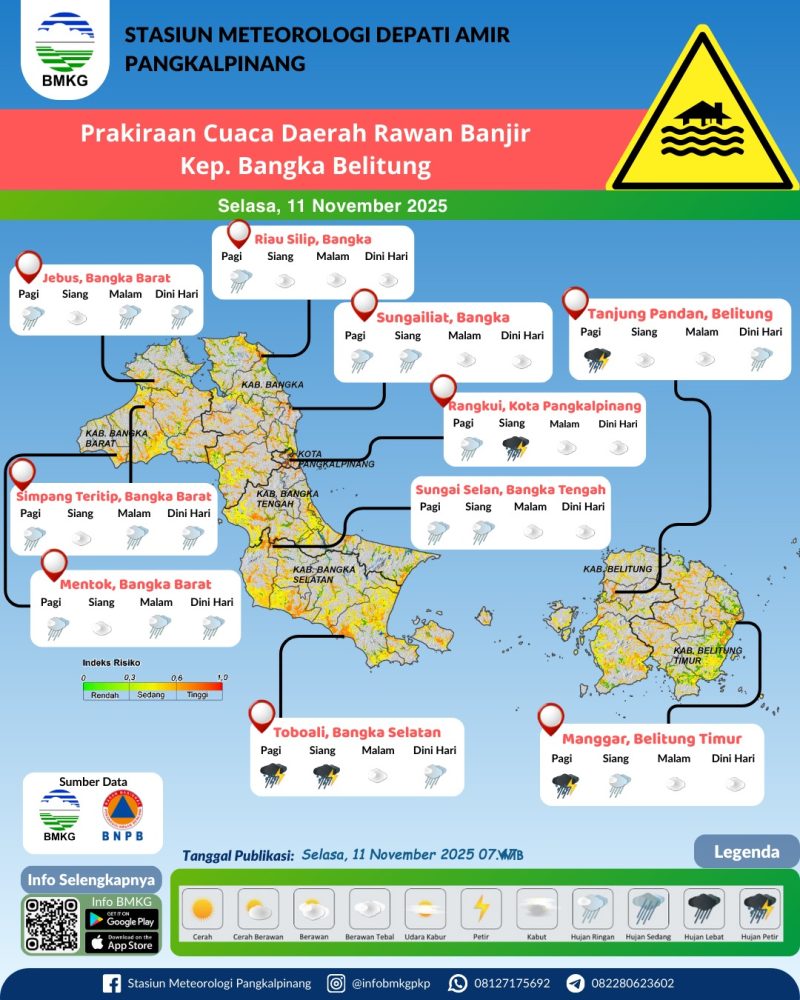 Selain ancaman hujan ekstrem di akhir pekan, BMKG juga merinci potensi kerawanan banjir harian yang terus bergeser antarwilayah. Pada Selasa (11/11/2025), hujan sedang disertai petir diprakirakan terjadi di Bangka Tengah, Bangka Selatan, dan Pangkalpinang pada malam hari. Indeks resiko banjir tinggi hari ini berfokus di Bangka Tengah dan Bangka Selatan.