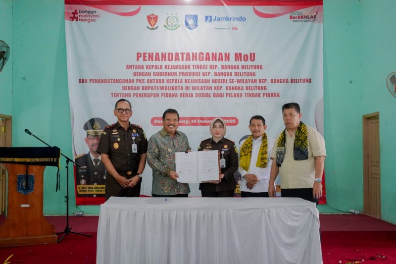 Penerapan pidana kerja sosial tersebut ditandai dengan penandatanganan Nota Kesepahaman (MoU) dan Perjanjian Kerja Sama (PKS) antara Pemerintah Kota Pangkalpinang dan Kejaksaan Negeri Pangkalpinang. Penandatanganan berlangsung di Balai Desa Namang, Bangka Tengah, Kamis (18/12/2025).