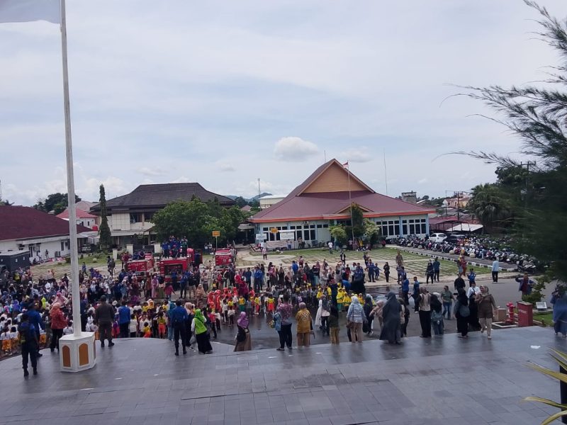 PANGKALPINANG, jendelapersada.com – Sirene meraung di halaman Kantor Walikota Pangkalpinang, Kamis (13/11/2025) pagi. Suaranya memecah keriuhan anak-anak PAUD dan TK yang berkumpul di tempat itu. Tiga unit mobil pemadam kebakaran berbaris di depan mereka. Beberapa petugas berpakaian lengkap dengan helm dan sepatu boot tampak bersiaga, seolah tengah menghadapi kebakaran sungguhan.