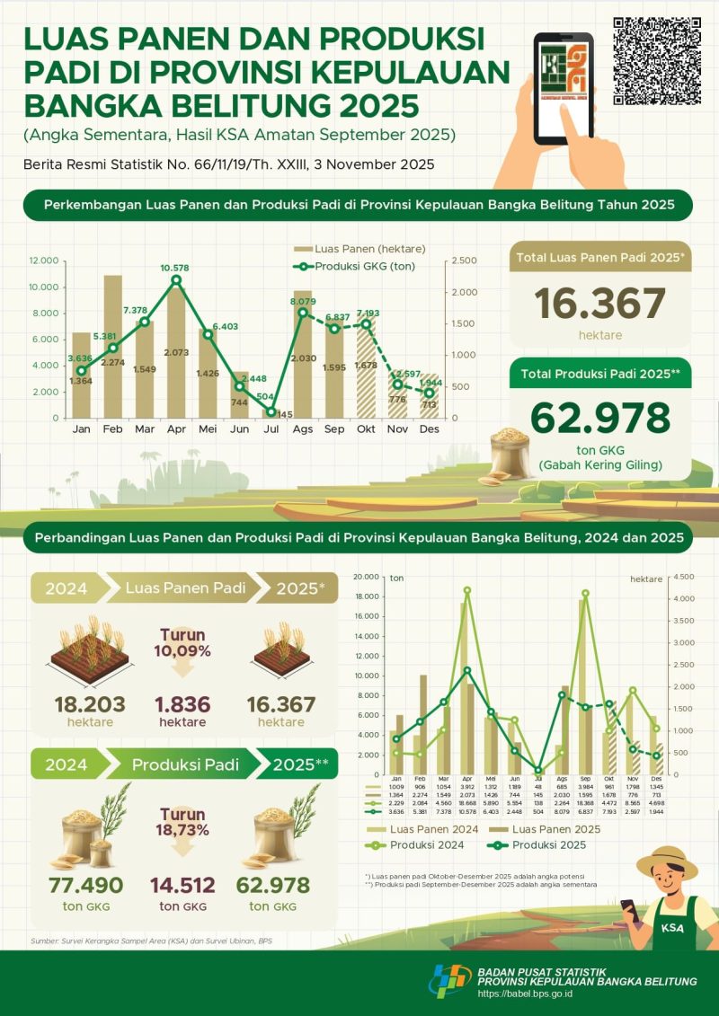 “Total produksi padi Babel pada tahun 2025 diperkirakan hanya mencapai 62.978 ton GKG, turun signifikan dari 77.490 ton GKG yang tercatat pada tahun 2024. Penurunan ini didorong oleh berkurangnya luas lahan panen,” jelas Toto H. Silitonga.